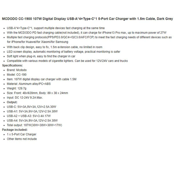 با توجه به ویژگیهای منحصر به فرد این مدل از جمله ۵ پورت USB و فناوری Quick Charge 3.0، شارژر فندکی مک دودو CC-1900 انتخاب مناسبی برای هر کابر خودرویی است که به شارژ سریع و امنیت اهمیت میدهد.