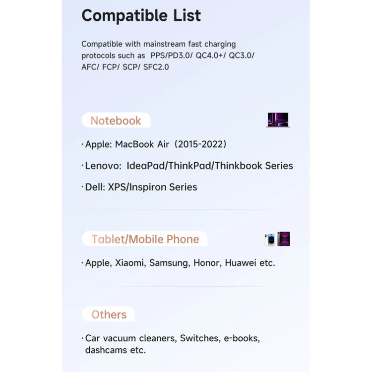 این محصول قابلیت شارژ تبلت و موبایل را با شدت جریان 2.0 آمپر و بالاتر دارد. همراهی این ویژگی با فناوری Quick Charge، موجب شارژ سریعتر و افزایش کارایی آن شده است.