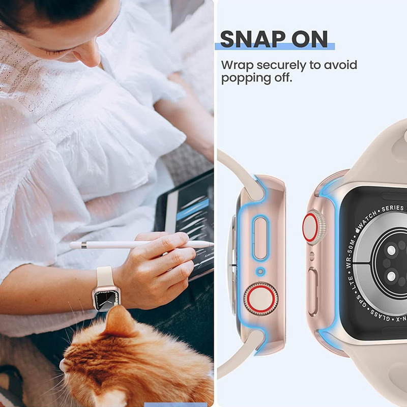کاور واچ من مدل full cover ، بدنهای از جنس پلیکربنات دارد. این متریال نسبت به TPU سختتر بوده و با اینکه نسبت به آن انعطافپذیری کمتری دارد ولی محافظ قویتر و مستحکمتری محسوب میشود. هرچند سخت بودن این کاور اختلالی در نصب آن ایجاد نمیکند و با کمی دقت میتوان به آسانی آن را روی ساعت نصب نمود. برشکاری دقیق کاور در قسمت دکمهها و پورتها سبب شده تا در دسترسی به آنها محدودیتی ایجاد نشود. علاوه بر این ضخامت کم این محصول اپل واچ شما را بیش از حد برجسته نمیکند و کاملا با ابعاد ساعت هماهنگ است.گلس حرارتدیده متصل به این کاور نیز با بهرهگیری از یک طراحی هوشمندانه به خوبی فشار لمس را به صفحه نمایش ساعت انتقال میدهد و تا حد ممکن اختلالی در عملکرد تاچ ایجاد نمیکند.
